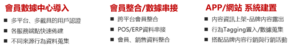 - 專屬會員顧客數據平台CDP:統一管理客戶資訊,進行個人化精準行銷。