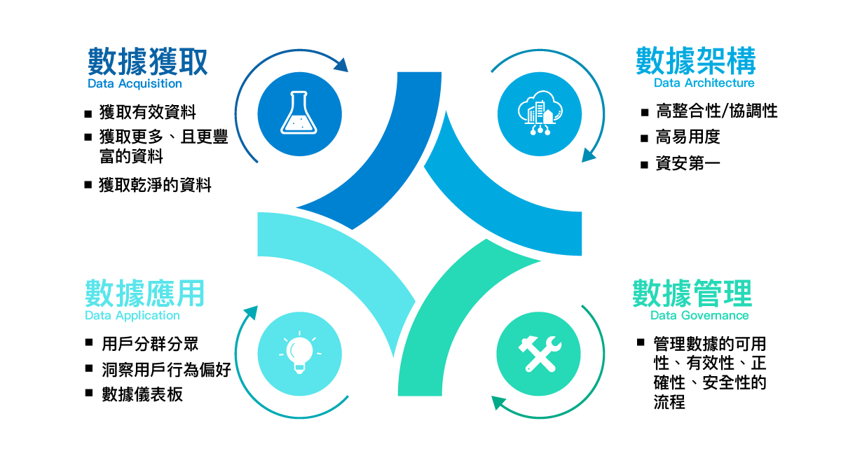 一個完整的數據策略必須要涵蓋這四個要素:數據的獲取、數據的架構、數據的管理、以及數據的應用,每一要素皆環環相扣,企業需擬定一個正確且符合企業文化之數據策略,才可以在一致的邏輯規劃中,搜集到有效且關鍵的資料並藉由大數據的運算,分析預測正確的結果,提供管理人員或行銷人員發動準確的攻擊!
